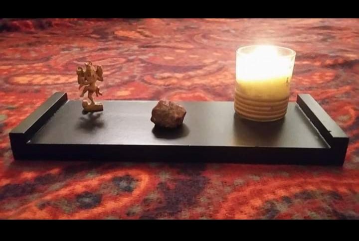 Photo d’illustration : Sous la bénédiction d’un Shiva Nataraja en bois de santal, se trouve au centre à première vue un vulgaire caillou mais qui s’avère en fait être un authentique rubis non taillé (provenance : Karnataka, Inde).